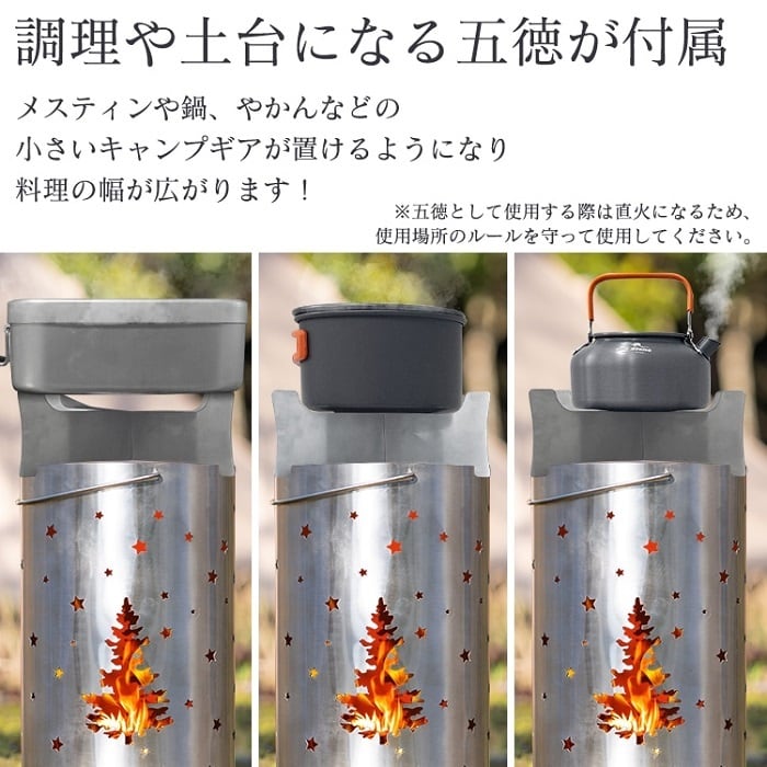 五徳付きで調理も簡単に行え、収納袋が付属しているため持ち運びも便利です。