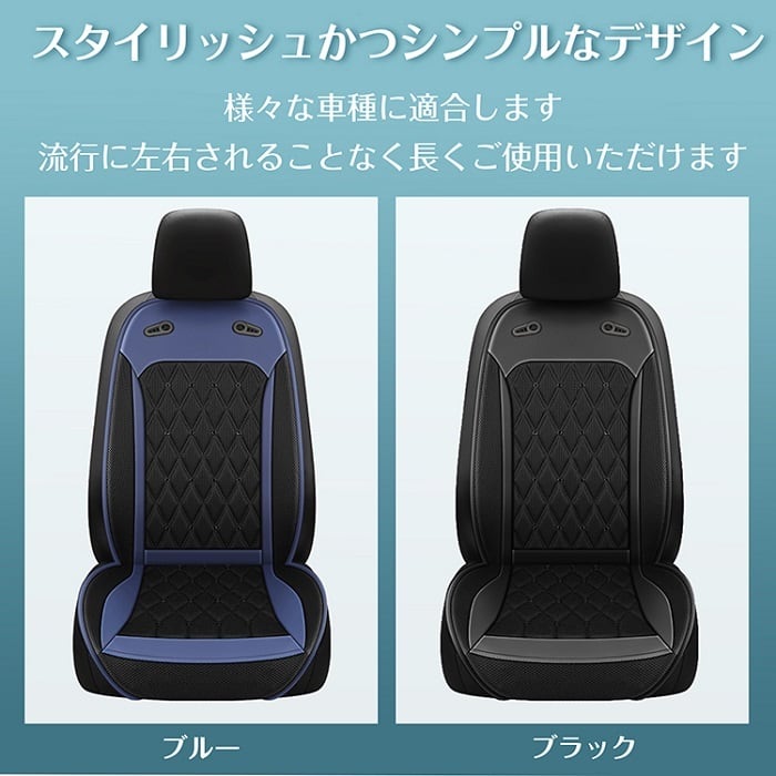 デザインはシンプルでありながらも、高級感のあるダイヤモンドパターンが特徴的。座面と背もたれ部分がしっかりと冷却されるため、暑い日の運転が格段に楽になります。風量は無段階で調整可能で、自分に最適なクールダウンレベルを選べます。